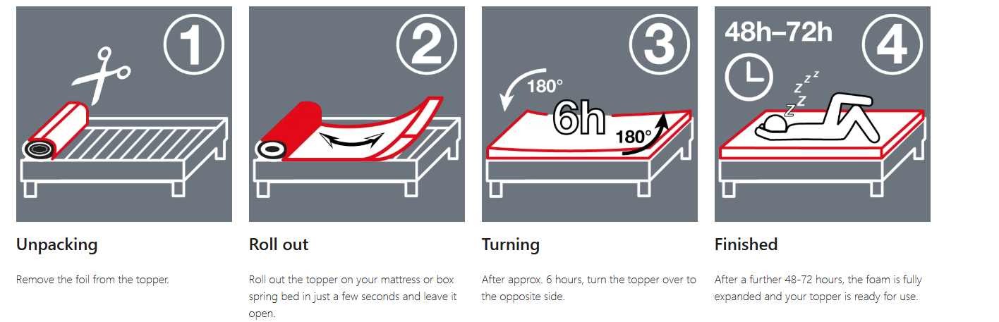 The topper is also suitable for bridging the gap between mattresses and can be easily rolled up when not in use. Its light weight makes it particularly easy to turn, which extends the life of the cold foam topper. And that’s not all: with its reversible design, you can change your sleeping style in no time at all.